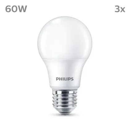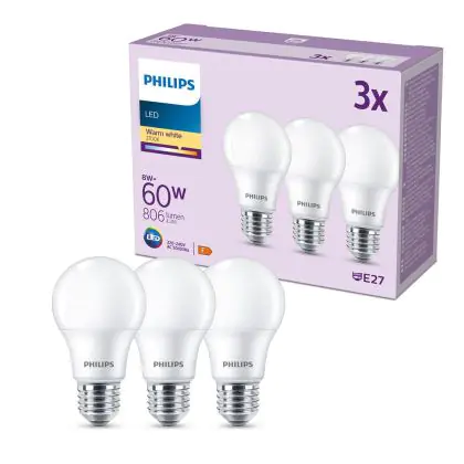 La Confezione Multipack 3x Philips Bulbo LED E27 Pera Ghiaccio 8W 806lm - 827 Bianco Molto Caldo è la perfetta sostituzione per la tua lampada convenzionale W con attacco E27 grazie alla sua tecnologia LED. Passare a LED ti offrirà tanti vantaggi!