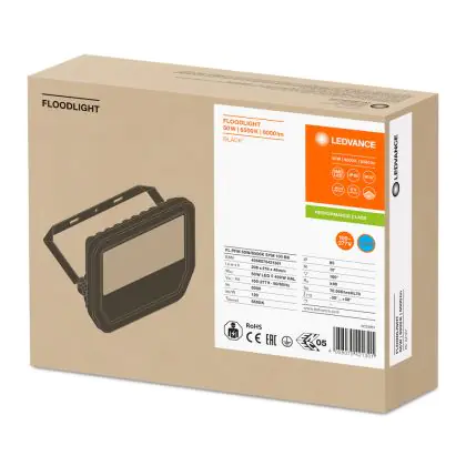 Descrizione Ledvance Proiettore LED GEN 3 Nero 50W 6000lm 100D - 865 Luce del Giorno | IP65 - Simmetrico - Sostitutiva 100W