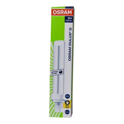 Questa lampada fluorescente compatta Dulux D OSRAM presenta l’attacco a innesto G24d-3 con due spinotti. Grazie alla tecnologia a fluorescenza, è un’ottima soluzione per un’illuminazione affidabile con un consumo energetico di 26W. È adatta per un’installazione negli apparecchi luminosi dotati di alimentatore convenzionale.