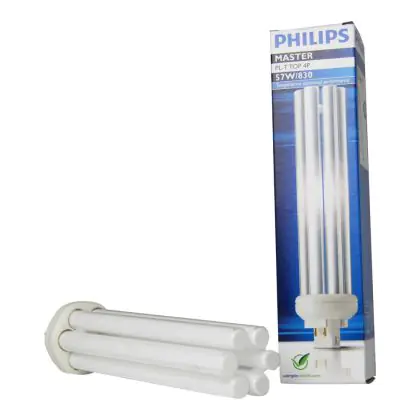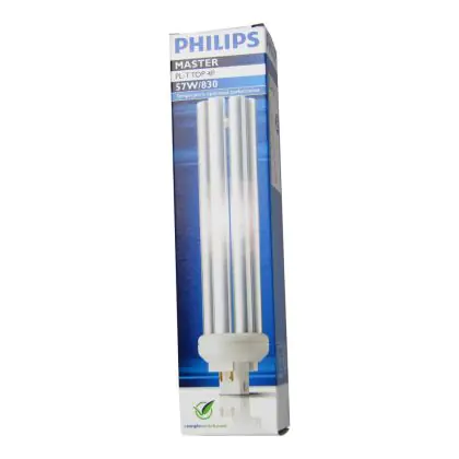 Le Philips PL-T TOP 57W 830 4P (MASTER) sono lampade fluorescenti compatte con contenuto di mercurio basso dotate di attacco GX24q-5 a 4 pin (perni). La potenza di queste lampade fluorescenti é pari a 57W. Quando decidi di sostituire le tue vecchie lampade fluorescenti compatte, assicurati di mantenere medesimo attacco, numero di pin (perni) e stessa potenza: in questo modo non avrai problemi nell'installazione. I vantaggi di tali lampade sono diversi: in particolare, presentano una vita lunga e sono altamente efficienti.