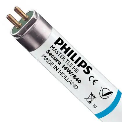 I Philips TL5 HE Secura 14W 840 - 55cm (MASTER) sono tubi fluorescenti estremamente efficienti caratterizzati da una potenza di 14W e provvisti di attacco G5 che rientrano nella classe energetica 'A'. Questi tubi, che misurano 55cm, hanno un rivestimento protettivo che trattiene le componenti della lampada in caso di rottura accidentale. La vita dei medesimi é in media di 24.000 ore e l'indice di resa cromatica si pone nell'intervallo di 80-89Ra. I tubi fluorescenti in questione profondono una luce bianca fredda (temperatura di colore 4000K).