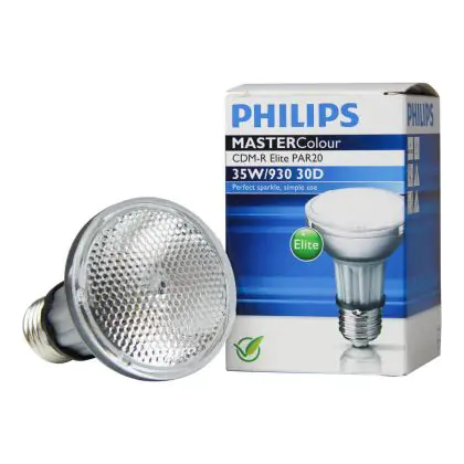 Le Philips CDM-R Elite 35W 930 E27 PAR20 30D (MASTERColour) sono lampade a scarica compatte ad alogenuri metallici in ceramica dotate di riflettore. Sono lampade estremamente efficienti che hanno una potenza pari 35W e presentano una base del tipo E27. La vita media di questi articoli é pari a 15000 ore. L'indice di resa cromatica si colloca nell'intervallo di 90-100Ra, a testimonianza dell'eccellente resa dei colori.
