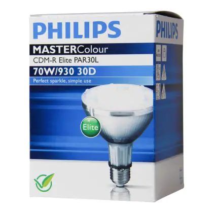 Le Philips CDM-R Elite 70W 930 E27 PAR30L 30D (MASTERColour) sono lampade a scarica compatte ad alogenuri metallici in ceramica dotate di riflettore. Queste lampade, note per la loro elevata efficienza, hanno una potenza pari a 70W e presentano un attacco del tipo E27. Presentano una vita media pari a 15.000 ore. L'indice di resa cromatica si assesta nell'intervallo di 90-100Ra: questo indica che i colori e le caratteristiche degli oggetti illuminati vengono esaltati incredibilmente.